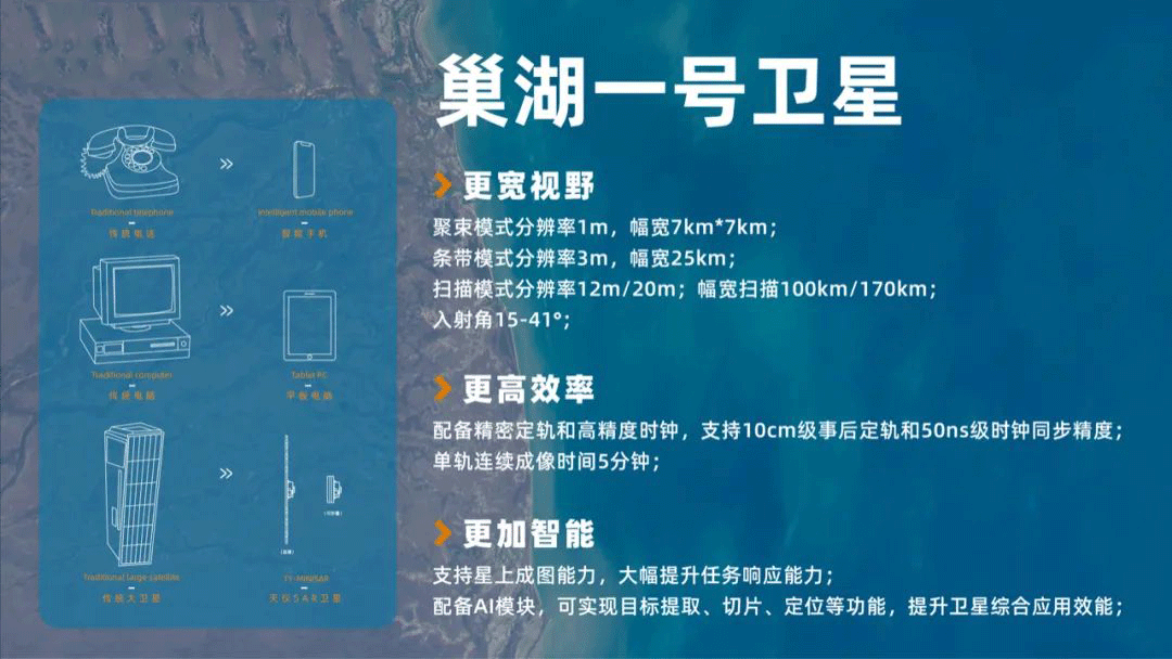 巢湖一号卫星是“天仙星座”首发星,随着巢湖一号卫星的成功发射将推动,“天仙星座”建设以及SAR数据行业应用,进一步优化了卫星平台和雷达载荷设计,使得卫星在成像幅宽、分辨率、最大成像时长、数据传输、轨控等核心能力上均有了显著的提升,并增加了区域多点目标的连续成像能力、精密定轨能力及在轨AI处理功能。